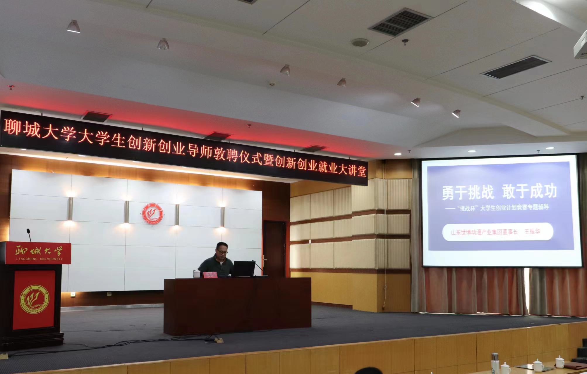 大学生创新创业导师敦聘仪式暨创业创新就业大讲堂在西校区图书馆大报告厅举行。山东省人大代表、泰山产业领军人才王振华应邀担任大学生创新创业导师及主讲嘉宾。校党委常委、副校长赵明吉,创新创业学院院长陈新令、校团委副书记解方文、85po