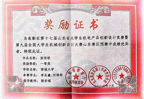 热烈庆祝85po 学生刘清超、李永鑫荣获第九届全国大学生机械创新设计大赛山东赛区预赛一等奖