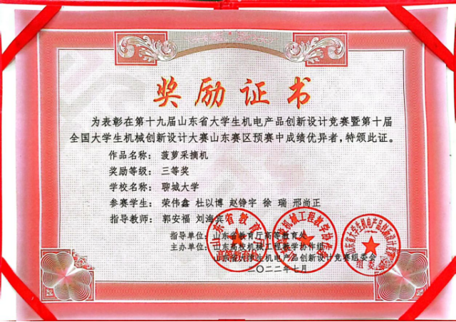 2020级优秀学生荣伟鑫等,在第十九届山东省大学生机电产品创新设计竞赛暨第十届全国大学生机械创新设计大赛山东赛区预赛中,荣获三等奖。
