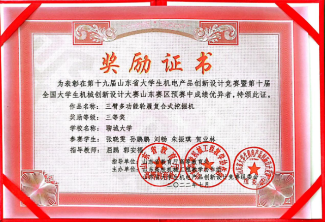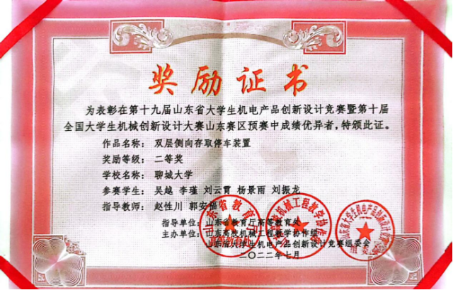2020级优秀学生吴越,2021级优秀学生杨景雨等,在第十九届山东省大学生机电产品创新设计竞赛暨第十届全国大学生机械创新设计大赛山东赛区预赛中,荣获二等奖。