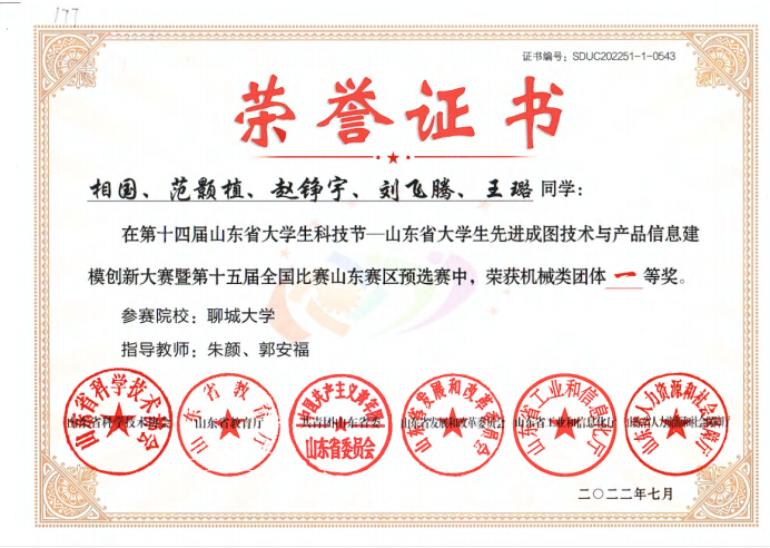 2021级优秀学生刘飞腾,在第十四届山东省大学生科技节—山东省大学生先进成图技术与产品信息建模创新大赛暨第十五届全国比赛山东赛区预选赛中,荣获机械类团体一等奖。