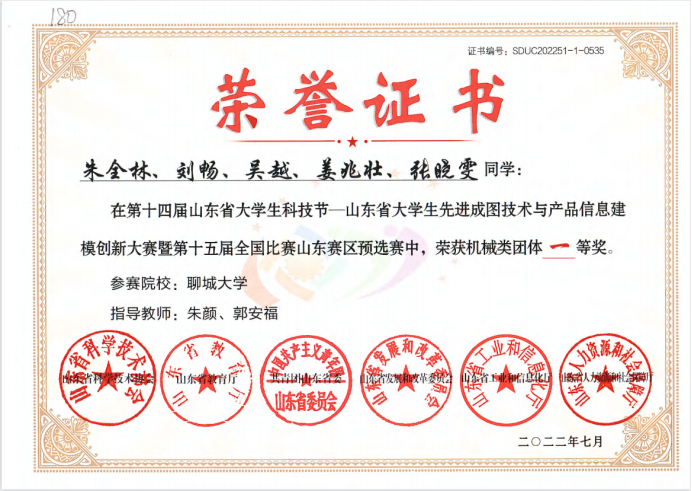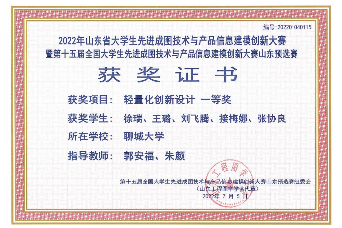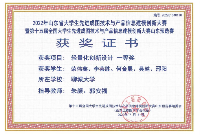 2020级优秀学生张协良、2021级优秀学生刘飞腾,在2022年山东省大学生先进成图技术与产品信息建模创新大赛暨第十五届全国大学生先进成图技术与产品信息建模创新大赛山东预选赛中,荣获轻量化创新设计一等奖。