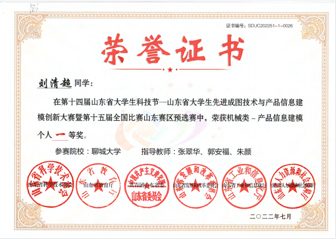2019级优秀学生刘清超,在第十四届山东省大学生科技节—山东省大学生先进成图技术与产品信息建模创新大赛暨第十五届全国比赛山东赛区预选赛中,荣获机械类—产品信息建模个人一等奖。