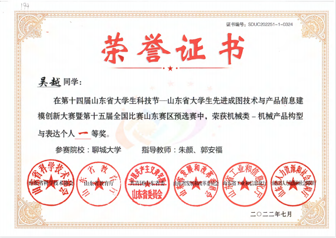 2020级优秀学生吴越,在第十四届山东省大学生科技节—山东省大学生先进成图技术与产品信息建模创新大赛暨第十五届全国比赛山东赛区预选赛中,荣获机械类—机械产品构型与表达个人一等奖。