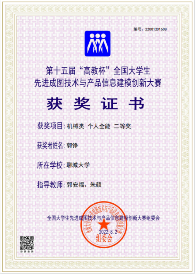 2020级优秀学生郭铮,在第十五届“高教杯”全国大学生先进成图技术与产品信息建模创新大赛中,荣获机械类个人全能二等奖。