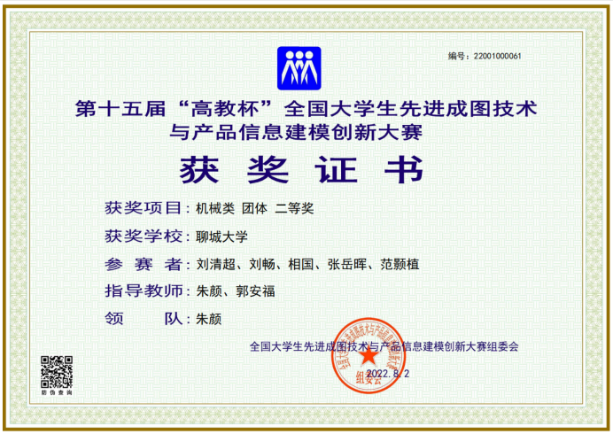 2019级优秀学生刘清超,在第十五届“高教杯”全国大学生先进成图技术与产品信息建模创新大赛中,荣获机械类团体二等奖。