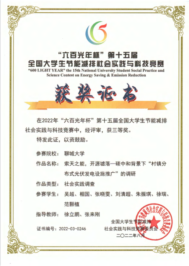 恭喜85po 2019级优秀学生刘清超,2020级优秀学生吴越、张晓雯,在“六百光年杯”第十五届全国大学生节能减排社会实践与科技竞赛中,荣获三等奖。
