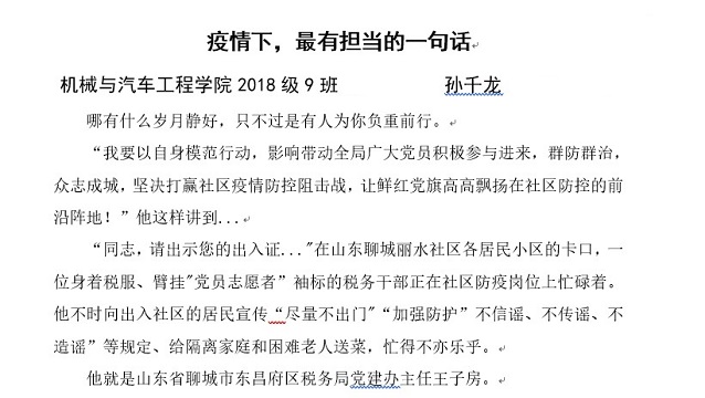 本次金句征集活动要求内容真实、具体,采用“金句+故事”结构进行讲述。在征集到的作品中,同学们聚焦邦外,“山川异域,风月同天”带来异国青年诗情画意的期盼,诉说着两国间的高情厚谊;有人将目光转到抗战一线,“说星星很亮的人,是因为你没有看过那些护士的眼睛”,康复患者泪目倾吐的感慨,感动着多少朝夕相处、与疫魔搏斗的白衣天使;“疫情面前没有例外,作为一名党员和驻村书记,我必须第一个站出来,冲在最前面!”老党员铿锵呐喊,向全天下昭示着其一生矢志践行的铮铮誓言。同学们将金句主人的事迹娓娓道来,一批又一批感人肺腑又铿锵有力的金句呈现到大家眼前,表达出大家对奋战在抗疫一线英雄们衷心的感激和祝愿。