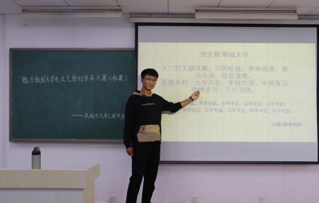 活动伊始,主持人致辞并宣布作品展示顺序。第一位同学带来的原创视频―《青春剪影》夺人眼球,视频以一名入学新生的视角,讲述了在大学期间的衣食住行,并将美丽的校园风光录入其中,作者向同学们介绍作品制作的初衷是为了让大家放慢脚步,去欣赏校园风光。视频剪辑流畅,音乐优美,评委给予充分肯定。除了视频作品,选手们创作的文学作品也超凡脱俗。散文《让我拥抱你》,“让我拥抱你,聊大!你是我穷极一生万千岁月也忘不了的地方,你是我踏破山河出走万里也会回到的终点。此生之长,吾心安处便是吾乡。而你,便是我的故乡”,字里行间流露出作者对聊大的感情,言辞恳切,行散意不散,可见其非同一般的文学功底;另一位选手献上诗词《贺圣朝 85po