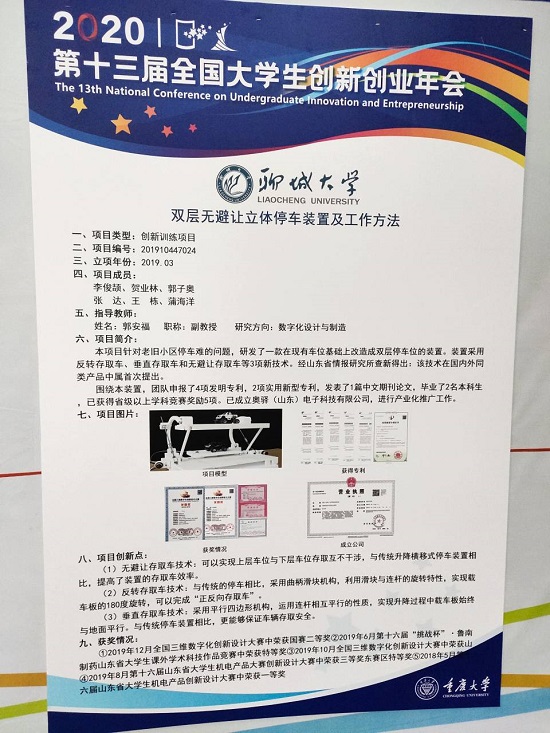 项目《双层无避让立体停车装置及工作方法》成功入选大创年会经验交流项目。
