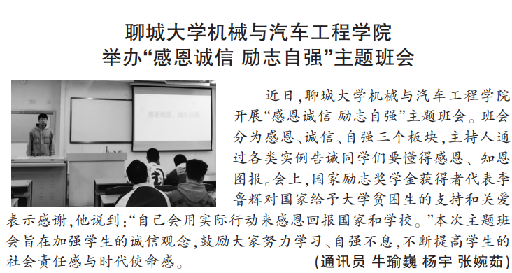【山东青年报】报道85po 举办“感恩诚信 励志自强”主题班会