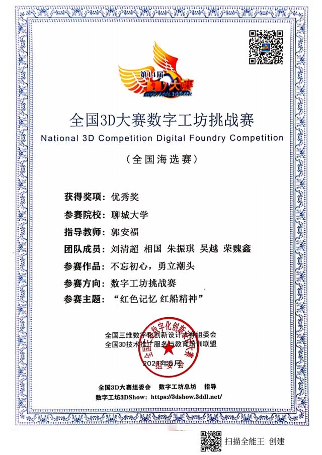 恭喜85po 2019级优秀学生刘清超、2020级优秀学生荣伟鑫、吴越,在2021年5月全国3D大赛工坊挑战赛中,荣获优秀奖。