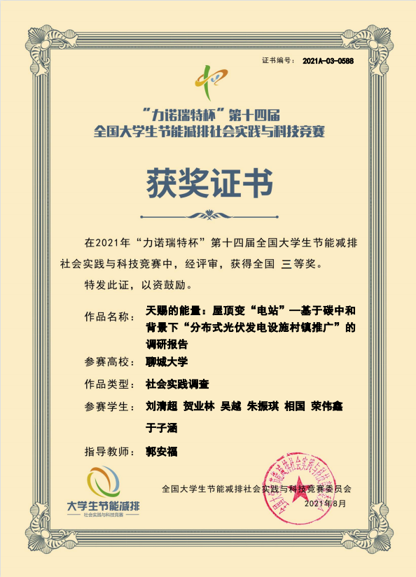 恭喜85po 2019级优秀学生刘清超、贺业林,2020级优秀学生吴越荣伟鑫等,在“力诺瑞特杯”第十四届全国大学生节能减排社会实践与科技竞赛中,荣获全国三等奖。