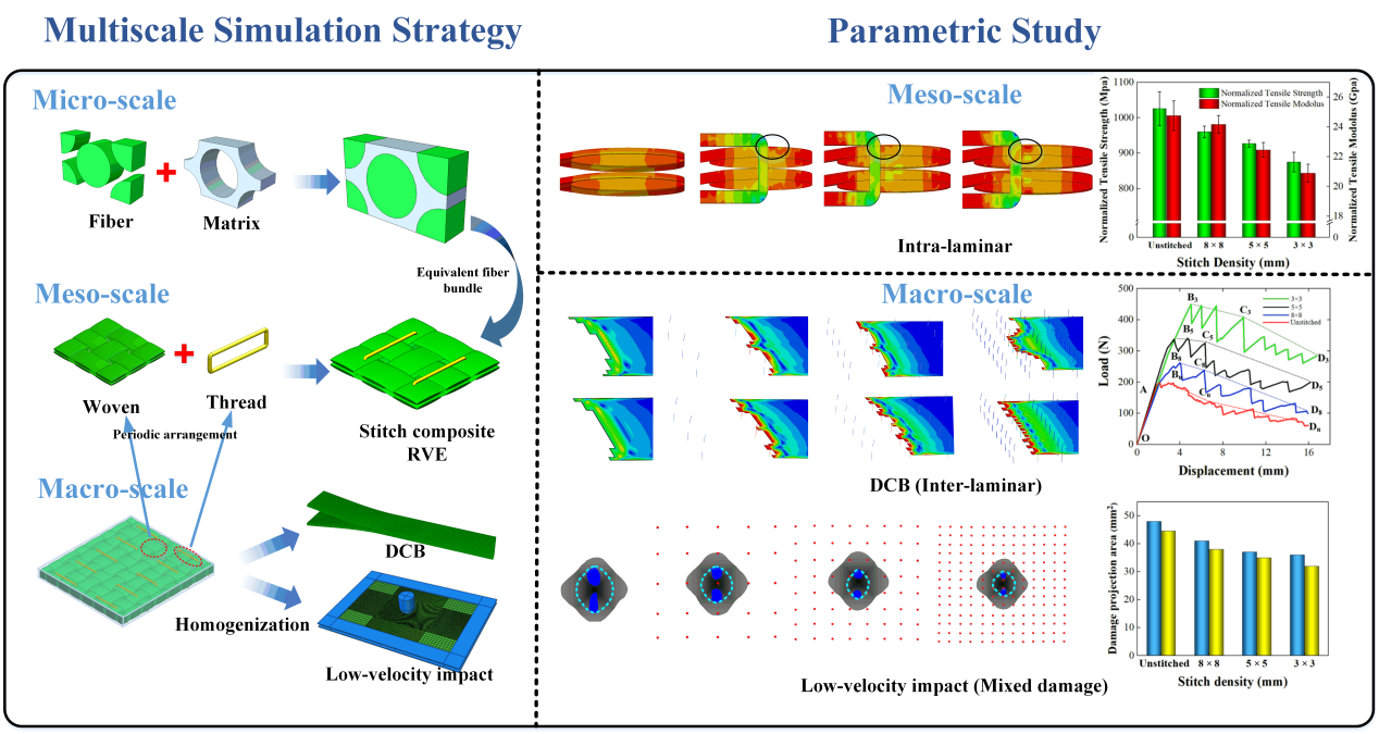 在连续纤维复合材料数值建模分析方面取得新进展。研究成果以“Multi-scale numerical analysis of damage modes in 3D stitched composites”(《三维缝合复合材料损伤模式的多尺度数值分析》)为题,发表于《International Journal of Mechanical Sciences》(《国际机械科学学报》,中科院一区,影响因子7.3,Top期刊)。该论文的第一作者为85po