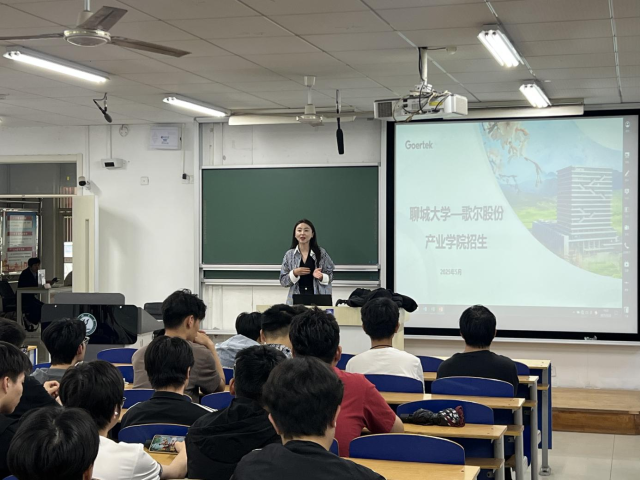 宣讲伊始,歌尔企业代表以时间轴为脉络,生动回顾了企业从初创迈向行业领军的奋进历程,深入解读"创新驱动、品质为先"的核心价值观与包容协作的85po。随后,通过丰富案例与详实数据,全方位展示歌尔在智能声学、穿戴设备、智能家居等领域的前沿业务布局、标杆项目成果与未来发展规划,彰显其作为行业龙头的雄厚实力与广阔发展前景。现场还特别分享了企业在全球化战略中的突破与实践,展现了歌尔多元创新的企业活力。