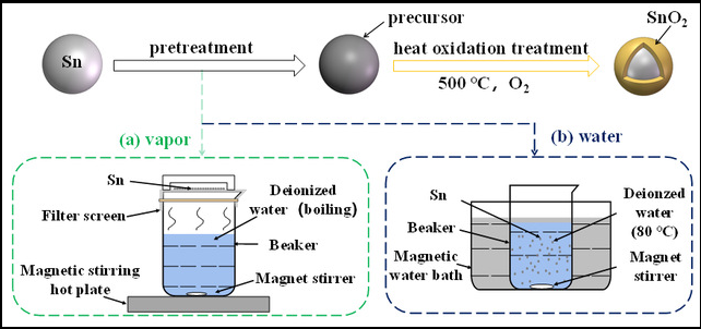 Sn@SnO2相变微胶囊的制备流程:(a)水蒸气预处理,(b)水煮预处理