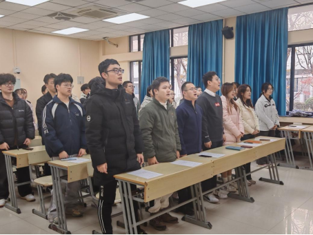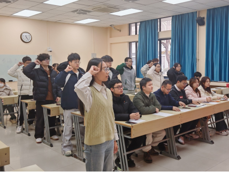 于博四B103教室举行新发展团员入团宣誓仪式。学院团委书记卜永强,专职辅导员王文礼,兼职辅导员孟涵、杨文欣、朱英浩、樊祺出席,院团委学生干部、24级各班团支书和16位新团员参加仪式。仪式由院团委学生副书记李泉润主持。