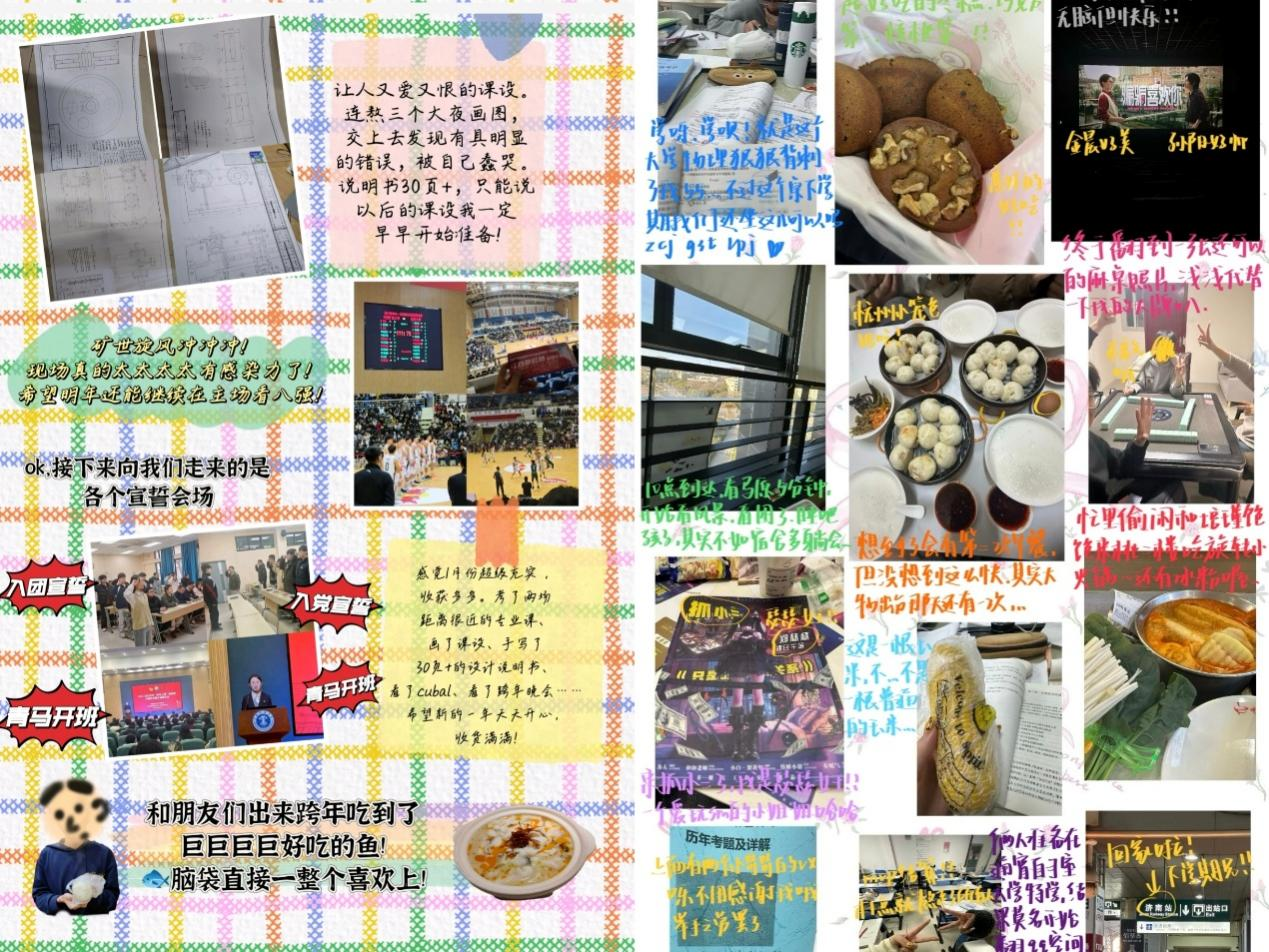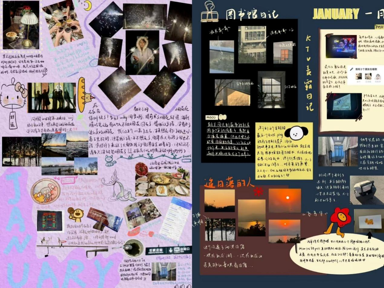 活动前期,工作人员充分利用线上平台,积极向全校师生宣传活动信息,鼓励同学们围绕本学期的生活进行创作。创作形式丰富多样,包括图片搭配文字感想、生动有趣的vlog视频、月度拼贴plog及纸质总结手账等,进行学期总结的同时记录自己对新年的愿望与期许。比赛最终评选出一等奖3名、二等奖7名和三等奖15名。