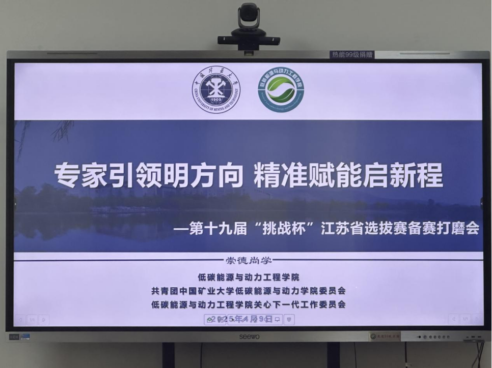 在计算机楼A229教室举行第十九届“挑战杯”江苏省选拔赛备赛打磨会。学院党委书记王守刚、党委副书记于基伯、关工委常务副主任郭楚文,团队指导教师、储能科学与工程系系主任朱春宇出席会议,学院重点培育团队代表代建龙参与答辩。