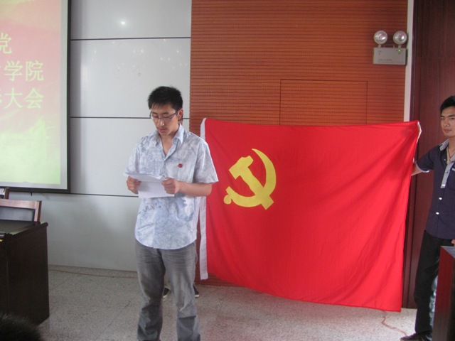 会议在庄严地国歌声中拉开了帷幕。团委书记田玉河首先宣读了优秀毕业生党员名单和校级优秀共产党员、先进学生党支部推荐名单。随后,党总支副书记张磊为院级优秀党员颁发荣誉证书并向他们表示祝贺。颁发完毕,全体起立,面对党旗,新党员进行入党宣誓,老党员重温党员誓词。