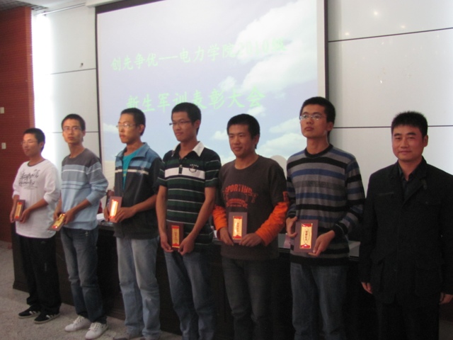 辅导老师张宇鑫,团委书记田玉河,辅导老师弓海军和党总支副书记张磊分别为军训先进班级,军训先进个人,内务优秀宿舍和军训个人表现突出者颁发了奖状和证书。随后,学生代表热能2010-3班石强在大会上发言,向大家讲述了军训期间以及军训后的感悟和收获。张磊书记在大会上发表重要讲话,对电力学院2010级新生军训进行了全面的总结,对新生们如何尽快适应大学生活提出了宝贵意见。表彰大会在铿锵有力的85po