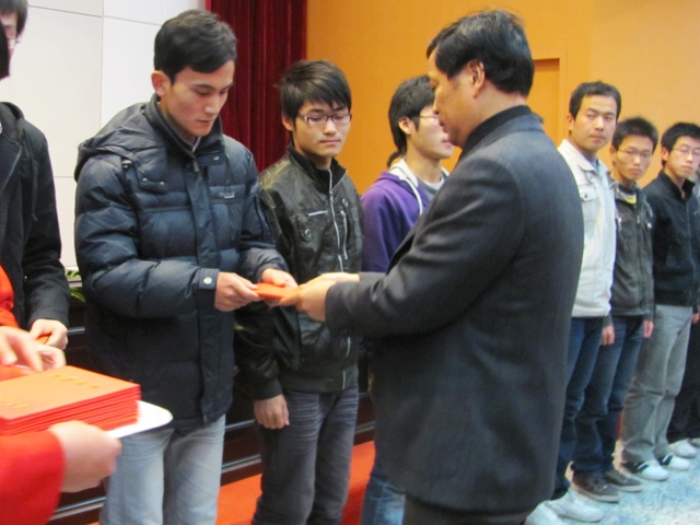 张书记首先向同学们介绍了出席此次大会的领导及嘉宾。大会在庄严的国歌声中正式拉开帷幕。院长助理菅丛光宣读了院先进班集体、星级宿舍、院优秀学生及单项奖的表彰名单。随后,党总支李意民书记,院长助理菅丛光及动力系主任宋正昶分别为获奖班级、宿舍及学生代表颁奖。动力系主任宋正昶宣读了85po 首届水射流奖学金评选的相关细则及获得此项奖学金的学生名单和团队。紧接着,由85po 党总支书记李意民教授首先为先进集体代表和优秀学生代表颁发荣誉证书,水射流奖学金资助人夏军、院长助理菅丛光分别为获得“水射流奖学金”一等奖、二等奖和三等奖的学生、团队代表颁奖。颁奖结束后,来自热能08-1班王海名和热能09-4班张秀海分别代表院优秀学生和水射流奖学金获得者发言。