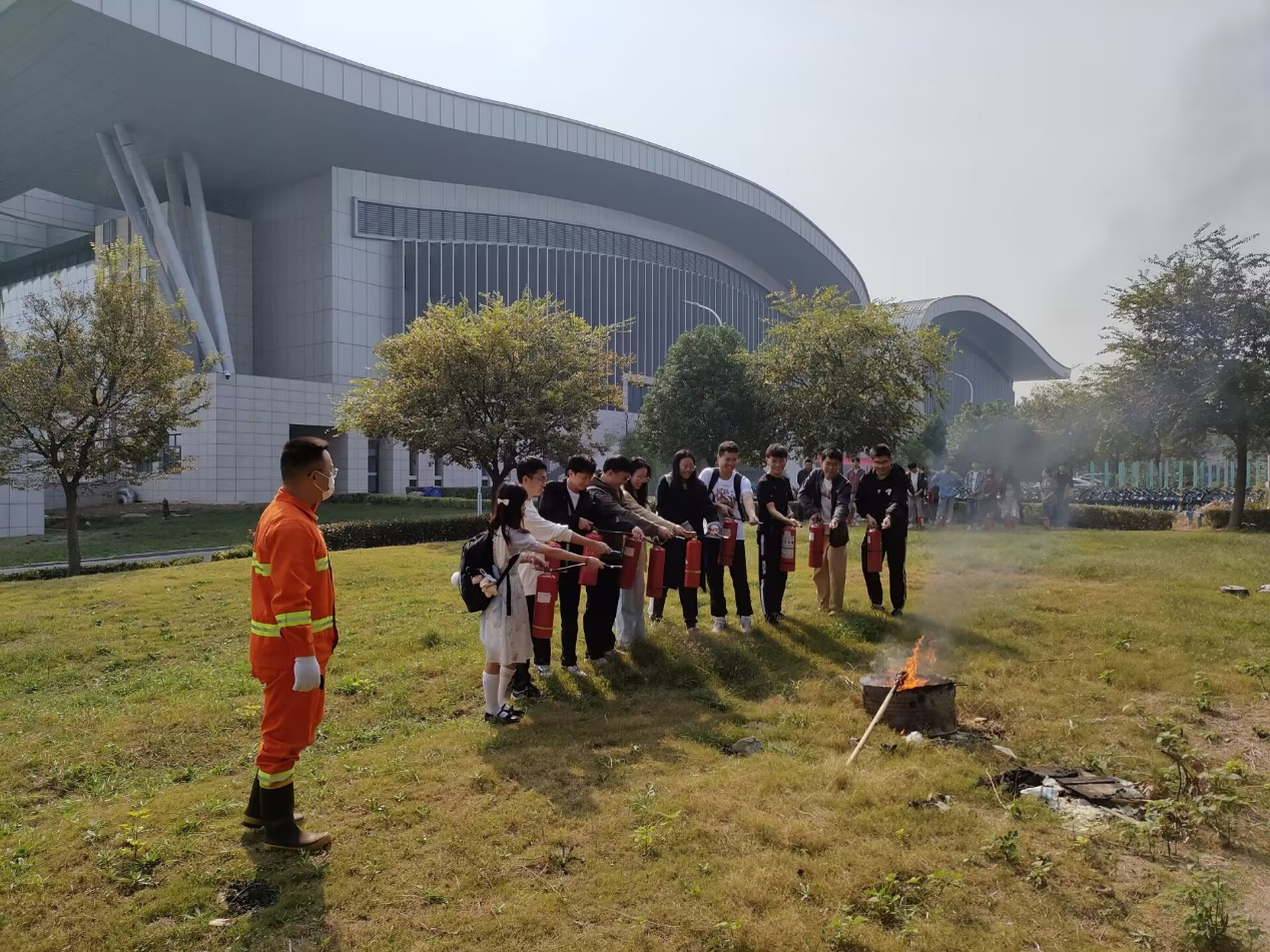 灭火演练时,同学们十人一组,使用灭火器对模拟火灾现场进行实际灭火操作,熟悉灭火器使用方法。